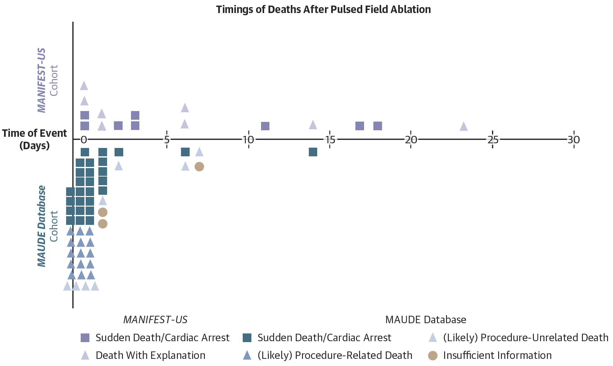Sudden/unexplained death or cardiac arrest occurred in ~1 in 5,000 patients in the MANIFEST-US registry. Studying these rare events will require learning from the patient, clinical and procedural characteristics of the rare patients who suffer these early unexplained deaths.